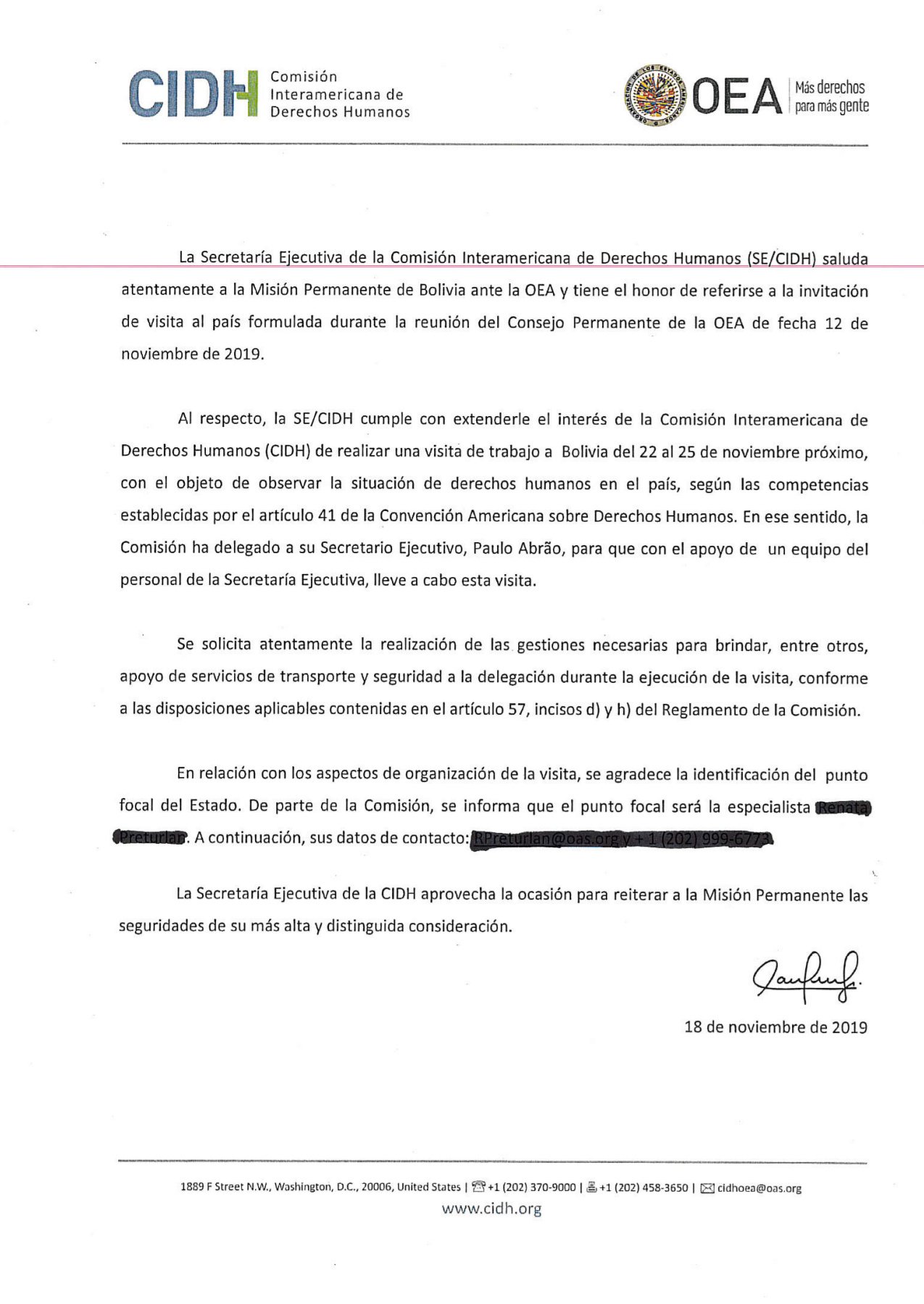 - Sollicitation d'une visite de terrain en Bolivie par la CIDH, du 22 au 25 novembre 2019