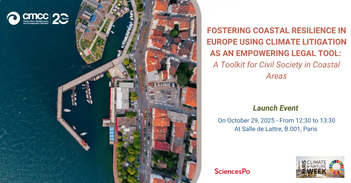This event marks the official launch of the 'Toolkit for Civil Society in Coastal Areas: Fostering Coastal Resilience in Europe Using Climate Litigation as an Empowering Legal Tool', produced by the Sea Legal Rise project, a collaboration between the CMCC Foundation and the Sciences Po Paris Law Clinic during the 2024–25 academic year.