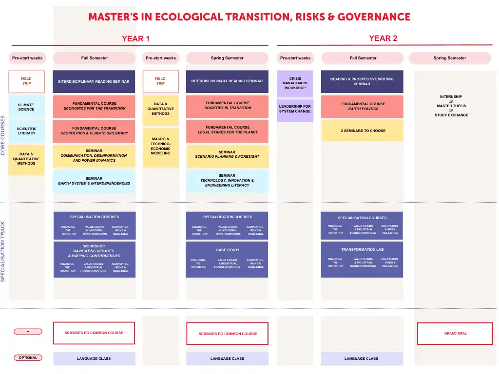 Le Master en transition écologique, risques et gouvernance de la Paris Climate School forme les étudiants à développer les outils, les compétences et les connaissances dont ils ont besoin pour comprendre, analyser et gérer efficacement les enjeux liés à la transition écologique, notamment les sciences du climat, les interdépendances terrestres et les systèmes énergétiques, les enjeux juridiques du changement climatique, l'économie de la transition, la géopolitique du climat et des ressources, etc.