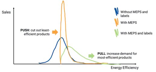 Both eco-design and energy labeling aim to transform the EU market for energy-related products. The theoretical effects, that the policy mix aims at, can be explained using market transformation theory(6): The MEPS under the eco-design directive act as a market push-factor, by cutting out least efficient products. The energy labels then act as a market pull-factor, by increasing the demand for most-efficient products.