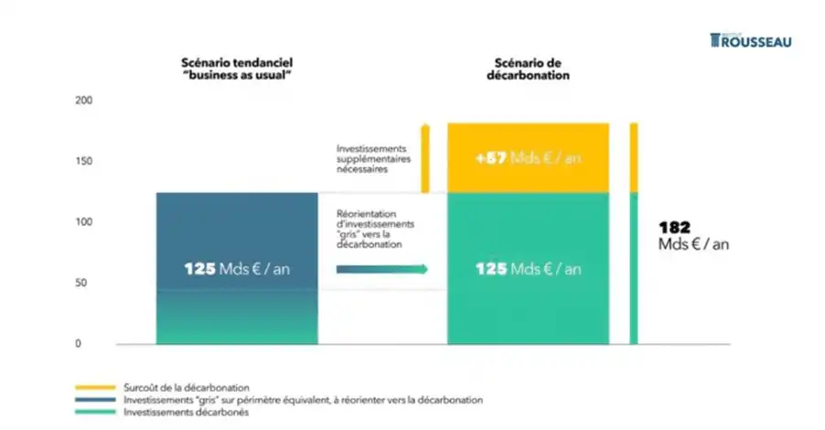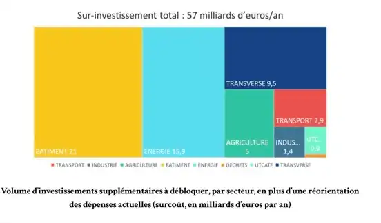 As has been seen with the SDG’s, the COP’s and the Green Deal, there is a fundamental gulf between climate objectives and the investments necessary to reach such environmental transitions. Director of Institut Rousseau Nicolas Dufrêne hence mentioned a relative “schizophrenia of public authorities”, characterized by committing to objectives they will not reach. The report ”2% for 2°"(10) by the Institute Rousseau takes a critical stance towards France’s climate action and proposes a complementary financing plan and alternative financing sources to drive the climate transition. It does not consider investment for biodiversity, water networks, soil pollution and emissions produced by imported products, which also have strong direct and indirect effects on climate and the environment. According to the report, 182 billions would be needed per year to finance the transition, which represents about 2,3% of France’s GDP in 2021. In addition to the 125 billion € already planned in a „trend scenario “, the report suggests that we need further 57 billion€ per year to achieve a “decarbonation scenario”.