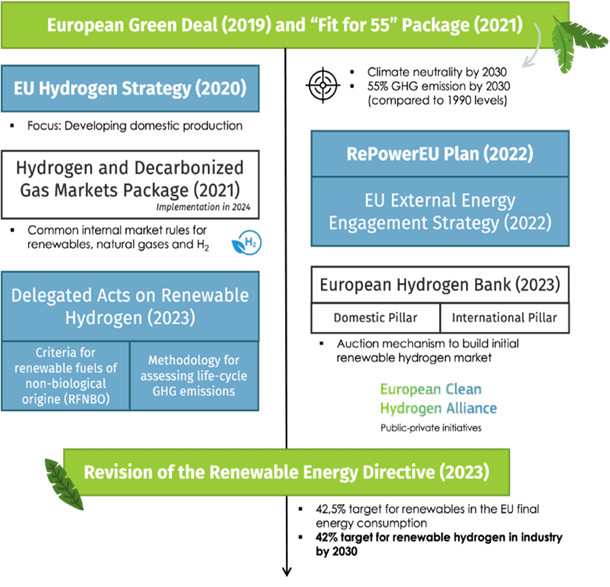 These targets have been accompanied by policy measures under the Fit-for-55 package to set the legal framework for incorporating hydrogen into EU energy markets and to facilitate its uptake. Two EU Delegated Acts on Renewable Hydrogen (2023) regulate the criteria for hydrogen and its derivatives to qualify as renewable and lay down the methodology for calculating its lifecycle greenhouse gasses (GHG) emissions(28). The EU Hydrogen and Gas Decarbonization package comprises measures to remove internal market barriers to develop a hydrogen market and designated infrastructure(29).