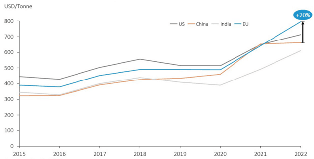 The second limitation pertains to the impact of green hydrogen on steel prices, as it remains costly. Currently, the price of 1 ton of steel is approximately €400, with coal costs making up €50. Replacing coal with green hydrogen would result in roughly a 30% price increase, as producing 1 ton of steel would require €180 worth of hydrogen at competitive prices of €3.6/kg. Although mass production could lower hydrogen production costs to an estimated €1.8/kg in the long term, it remains expensive now [44]. These higher prices threaten the EU’s competitiveness abroad, particularly since EU steel is already pricier than its main competitors (see Figure 6 below). While the ETS scheme may help the European steel industry remain competitive within the EU, it will struggle to export against more competitive American and Chinese steel. Additionally, rising steel prices would negatively affect the costs and competitiveness of other steel-dependent industries, such as the automobile sector.
