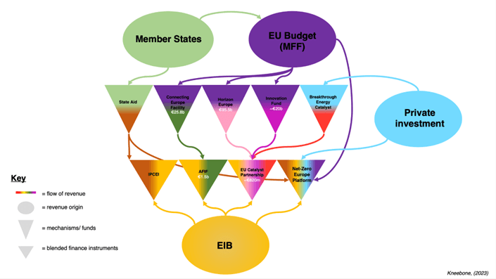 Tracking green hydrogen funding remains complex, with contributions from EU-wide funds, national schemes, private investments, and blended financing instruments(35). Figure 3 maps the flow of EU funds, starting from broad sources like the EU budget, bonds, and Emission Trading System (ETS) revenues, which funnel into major programs such as Horizon Europe before reaching hydrogen-specific instruments like the Hydrogen Bank. Color-coding highlights how funds are mixed and repurposed at various stages. Figure 4 illustrates blended financing, where EU institutions partner with private investors through initiatives like Breakthrough Energy Catalyst, with the European Investment Bank (EIB) also playing a significant role. Additionally, Member States contribute through their national initiatives, further complicating the funding landscape.