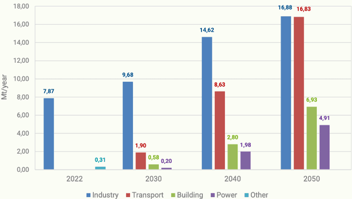 As shown in Figure 1, the hydrogen demand in the EU is expected to surge from 8 megatons (Mt) to over 45 Mt per year by 2050. This growth is projected across all sectors, particularly in Industry and Transportation. In 2022, green hydrogen represented only a minimal share of 0.2% of the total hydrogen production(13). The EU’s current strategy under REPowerEU sets the goal of producing 10 Mt and importing an additional 10 Mt(14). Although this may seem ambitious, experts believe the objectives are achievable if all announced projects are successfully implemented.