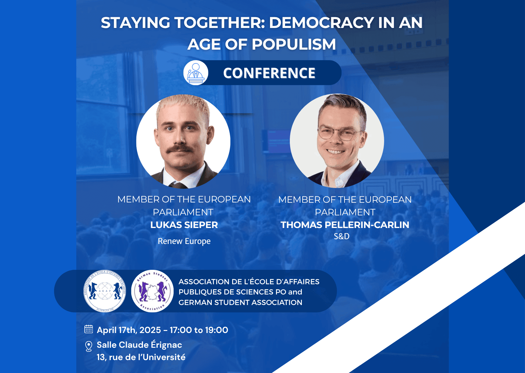 L’Association de l’École d’Affaires Publiques de Sciences Po (AEAP) et la German Student Association (GSA) sont heureuses de vous convier à sa prochaine conférence, intitulée « Staying Together: Democracy in an Age of Populism », qui se tiendra le 17 avril à 17h à Sciences Po, dans l’amphithéâtre Erignac (13 rue de l’Université, Paris).
