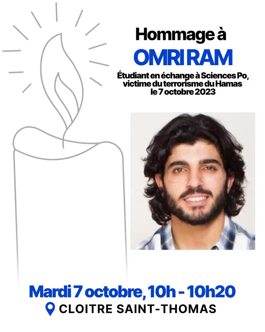 Cérémonie d'hommage, appel au recueillement et minute de Silence en Hommage à Omri Ram, étudiant de Sciences Po, assassiné le 7 octobre 2023 par le Hamas.